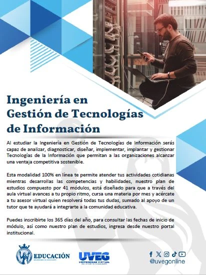 Al estudiar la Ingeniería en Gestión de Tecnologías de Información serás capaz de analizar, diagnosticar, diseñar, implementar, implantar y gestionar tecnologías de la Información que permitan a las organizaciones alcanzar una ventaja competitiva sostenible.