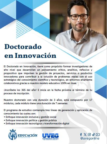 El programa del Doctorado en Innovación de la Universidad Virtual del Estado de Guanajuato (UVEG), está dirigido a todos aquellos profesionistas que tengan el propósito de formarse como investigadores capaces de intervenir en la realidad social, tecno- económica y pública, mediante el diseño y la ejecución de proyectos de innovación que incidan en el bienestar socioeconómico y promuevan la sostenibilidad en lo local, regional y global.