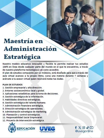 El plan de estudios de la Maestría en Administración Estratégica está compuesto de 12 módulos, cada módulo tiene una duración de 7 semanas.
