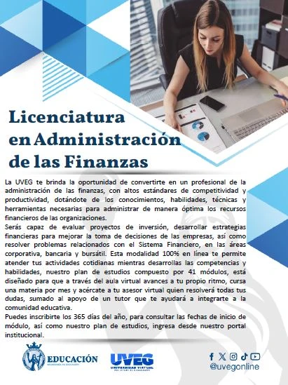 Al egresar serás capaz de evaluar proyectos de inversión, desarrollar estrategias financieras para mejorar la toma de decisiones de las empresas, así como resolver problemas relacionados con el Sistema Financiero, en las áreas corporativa, bancaria y bursátil. UVEG te brinda la oportunidad de especializarte en una de las tres áreas que ofrece en este programa: Capital Humano, Mercadotecnia o Finanzas.