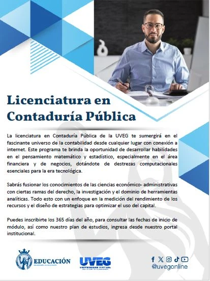 La licenciatura en Contaduría Pública de la UVEG te sumergirá en el fascinante universo de la contabilidad desde cualquier lugar con conexión a internet. Este programa te brinda la oportunidad de desarrollar habilidades en el pensamiento matemático y estadístico, especialmente en el área financiera y de negocios, dotándote de destrezas computacionales esenciales para la era tecnológica.