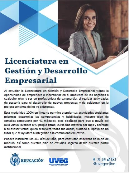 Estudia con nosotros este programa 100% en línea, el cual te permite estudiar y trabajar al mismo tiempo. Al estudiar la Licenciatura en Gestión y Desarrollo Empresarial tienes la oportunidad de adquirir los conocimientos para emprender con éxito o incursionar en el ambiente de los negocios en cualquier nivel. Conviértete en un profesionista capaz de brindar propuestas vanguardistas y con capacidad de conducir organizaciones a través de la planificación y ejecución de estrategias al optimizar los recursos de los que disponen. Adquiere habilidades en alta dirección para llevar a las empresas hacia el cumplimiento de sus objetivos en tiempos adecuados cuidando de los procedimientos establecidos, así como de los aspectos legales y éticos.