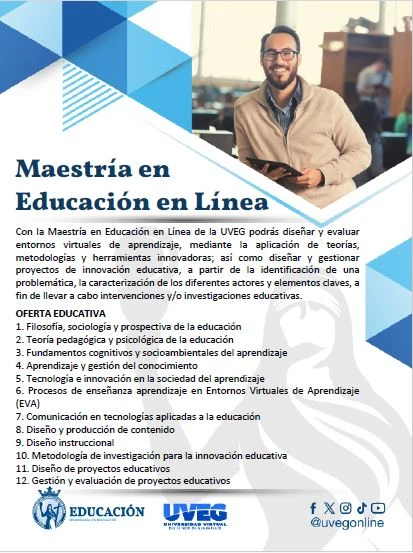Con la Maestría en Educación en Línea de la UVEG podrás diseñar y evaluar entornos virtuales de aprendizaje, mediante la aplicación de teorías, metodologías y herramientas innovadoras; así como diseñar y gestionar proyectos de innovación educativa, a partir de la identificación de una problemática, la caracterización de los diferentes actores y elementos claves, a fin de llevar a cabo intervenciones y/o investigaciones educativas.