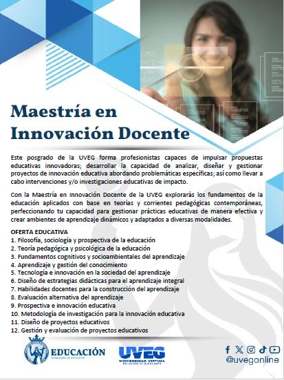 Con la Maestría en Innovación Docente de la UVEG explorarás los fundamentos de la educación aplicados con base en teorías y corrientes pedagógicas contemporáneas, perfeccionando tu capacidad para gestionar prácticas educativas de manera efectiva y crear ambientes de aprendizaje dinámicos y adaptados a diversas modalidades.