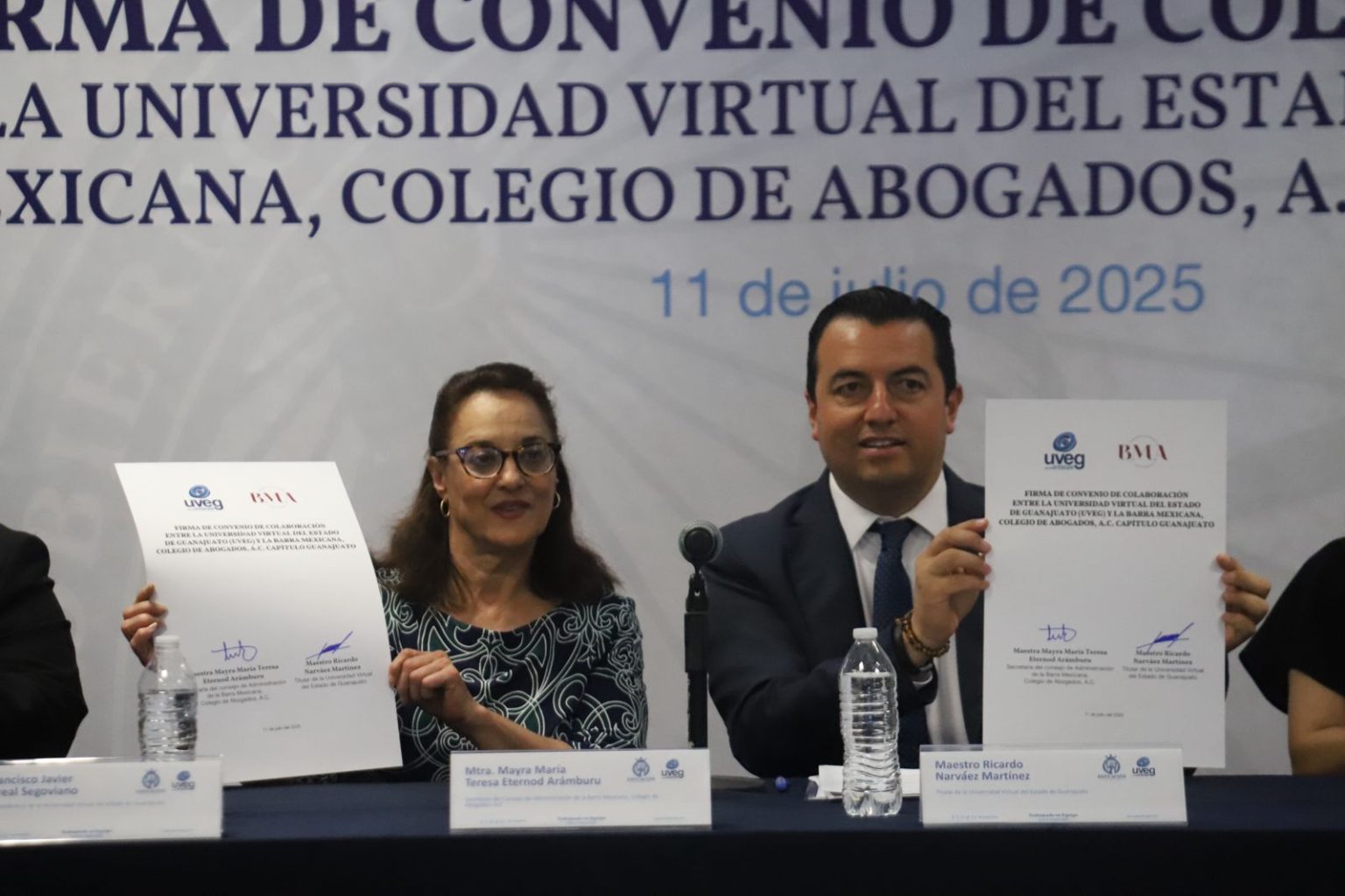 Silao, Guanajuato, 11 de Julio de 2025. En el marco del Día de la Abogacía, la Universidad Virtual del Estado de Guanajuato (UVEG) firmó un convenio de colaboración con la Barra Mexicana, Colegio de Abogados, A.C., para fortalecer la formación jurídica, el intercambio de conocimientos y la vinculación académica.