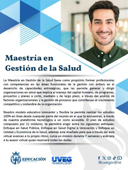 El programa de la Maestría en Gestión de la Salud ofrecido por la Universidad Virtual del Estado de Guanajuato (UVEG), está dirigido a todos aquellos profesionistas que tengan el propósito de ampliar su trayectoria profesional como gestores de una organización de salud.